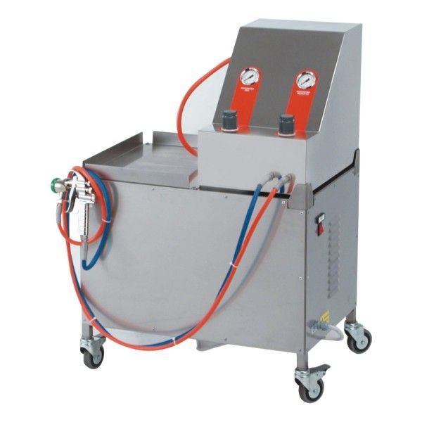 Dispenserul este destinat pulverizarii albusului/galbenusului pe prajituri sau uleiului pe forme si tavi de copt. Produsul este aspirat direct din container si pompat catre gura de evacuare. Aerul comprimat si produsul ajung impreuna la gura de evacuare si sunt pulverizate simultan. Pentru obtinerea celor mai bune rezultate, presiunea aerului si a produsului pot fi reglate separat.