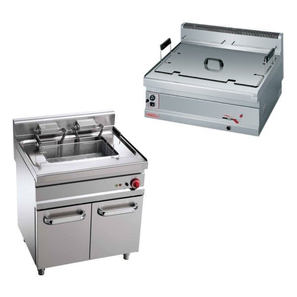 La modelele pe gaz, fiecare recipient este dotat cu arzatoare tubulare din otel inoxidabil cu sistem suflant care regleaza debitul flacarii, crescand randamentul cu 50 %. Puterea este distribuita pe o suprafata larga respectand normele care stabilesc un maxim de 5W/cm². Arzatoarele cu combustie optimizata sunt prevazute cu termocupla cu valva si termostat de siguranta, flacara pilot protejata si aprindere piezoelectrica. Exista 7 trepte de reglare a temperaturii in intervalul 110 - 190ºC. Friteusele de patiserie pot fi dotate (optional) cu 2 cosuri simple sau 4 semi-cosuri, ideale chiar si pentru uz gastronomic.