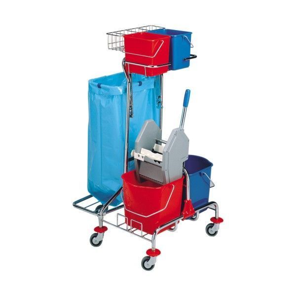 Carucior multifunctional cromat cu roti, suport pentru sac, 1 galeata 15 l, cutie clatire, cos 2-6 l, suport sticla, suport perie, 750 x 460 x 1220h mm