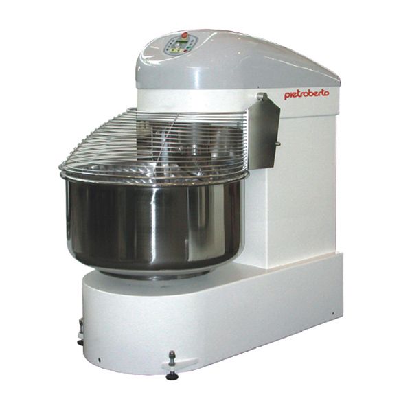 Structura: din otel vopsit cu pulbere epoxidica. Vas, spirala si tija centrala din otel inox AISI 304. Sistem de transmisie pe curele si vas cu motor reductor. Doua motoare independente (clasa de protectie IP 54) pentru vas si spirala. Dispozitiv de siguranta din otel inox AISI 304. Panou multifunctional de comanda: tastatura cu membrana, rezistenta la presiune, cu suprafata din policarbonat anti abraziv, afisaj pe doua randuri pentru 19 caractere alfanumerice, permitand setarea usoara a datei si literelor, precum si a programarii fazelor de mixare, afisaj si control pentru temperatura aluatului. Memoria poate inregistra 50 de retete, pentru fiecare reteta putandu-se memora 15 faze. Grad de protectie electrica IP 55 (impotriva prafului, infiltratiilor de faina si pulverizarii cu apa). Picioare pentru stabilitatea masinii. Mobilitate facila gratie celor doua roti fixe posterioare si a celor doua roti mobile frontale. Utilajul este construit in conformitate cu legislatia in vigoare referitoare la prevenirea accidentelor, igiena si electricitate.