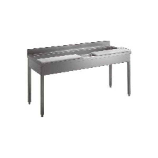 Realizata din otel-inox AISI 304 cu finisaj Scotch Brite. Blat de lucru si rebord cu inaltimea de 100 mm. Picioare reglabile pe inaltime cu sectiune patrata 40 x 40mm. Cuva, drenaj, supraplin, blat de taiere din polietilena si orificiu evacuare. Masa poate fi dotata cu polite, sifon, buson si sterilizator de perete pentru cutite.