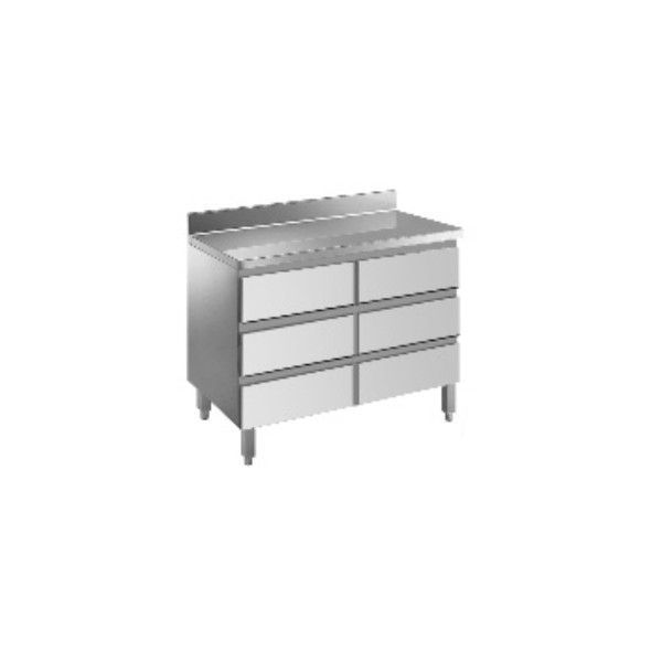 Realizat din otel inox AISI 304 cu finisaj Scotch Brite. Este prevazut cu blat de lucru si structura fono-absorbanta si ranforsata. Rebord 100 mm. Picioare tubulare 40 x 40 mm reglabile pe inaltime. Poate fi accesorizat cu rotile.